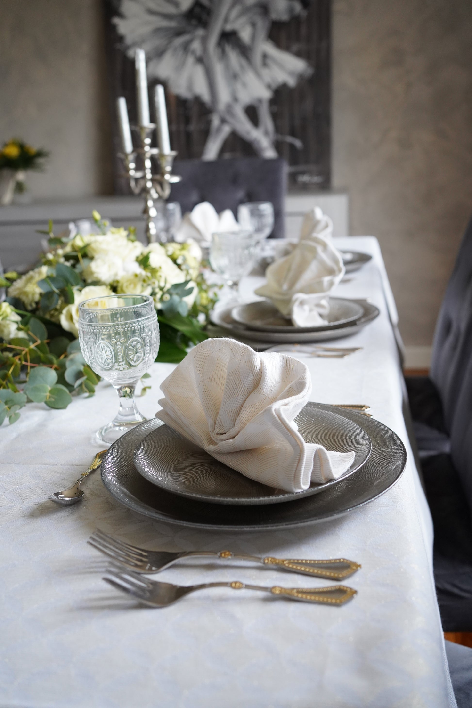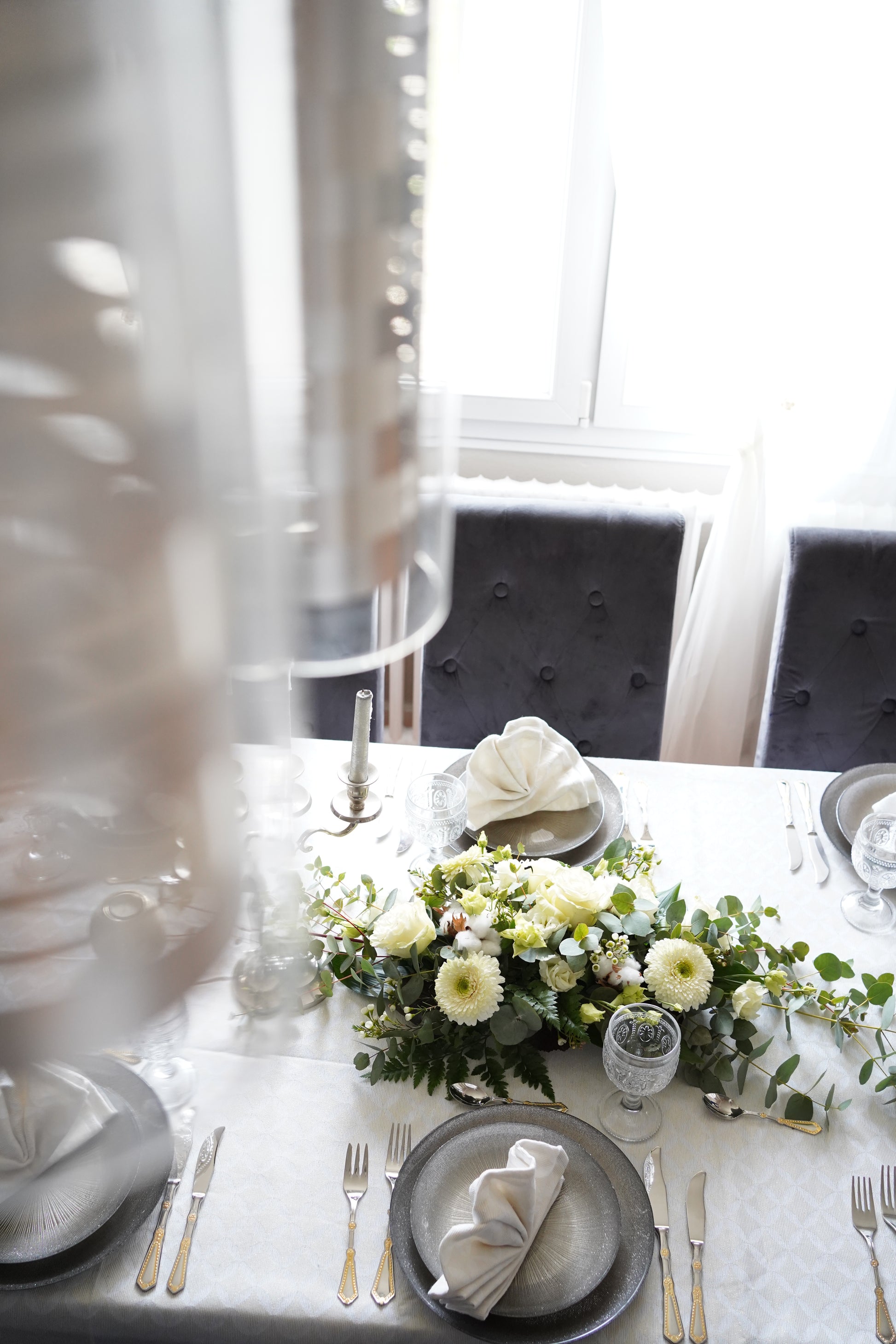 Sublimez vos événements avec notre service de location de décoration de table élégante comprenant des assiettes grises raffinées.